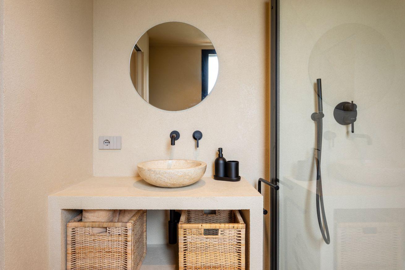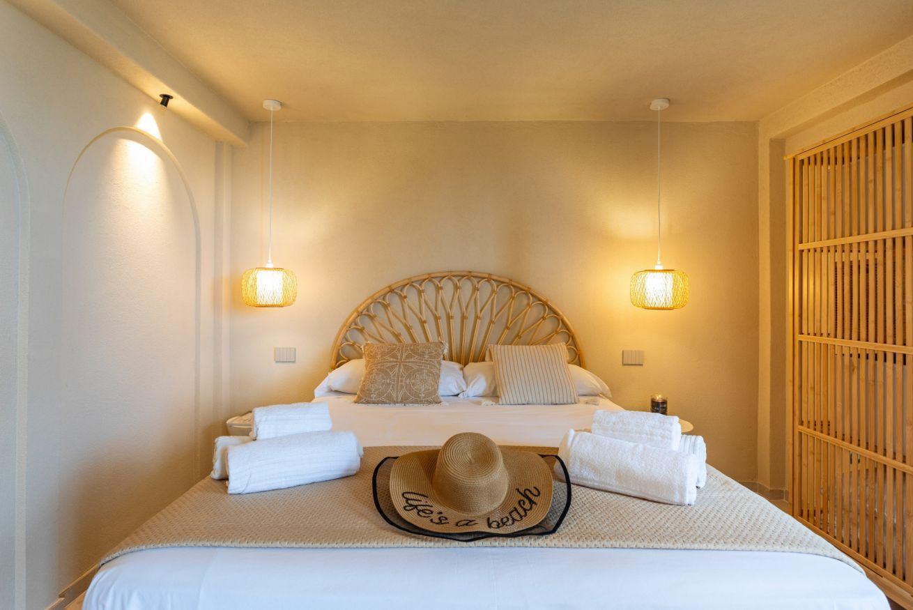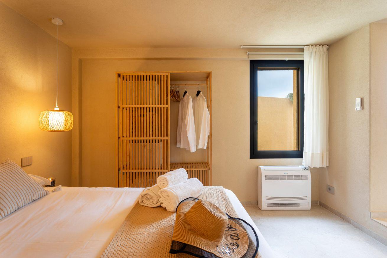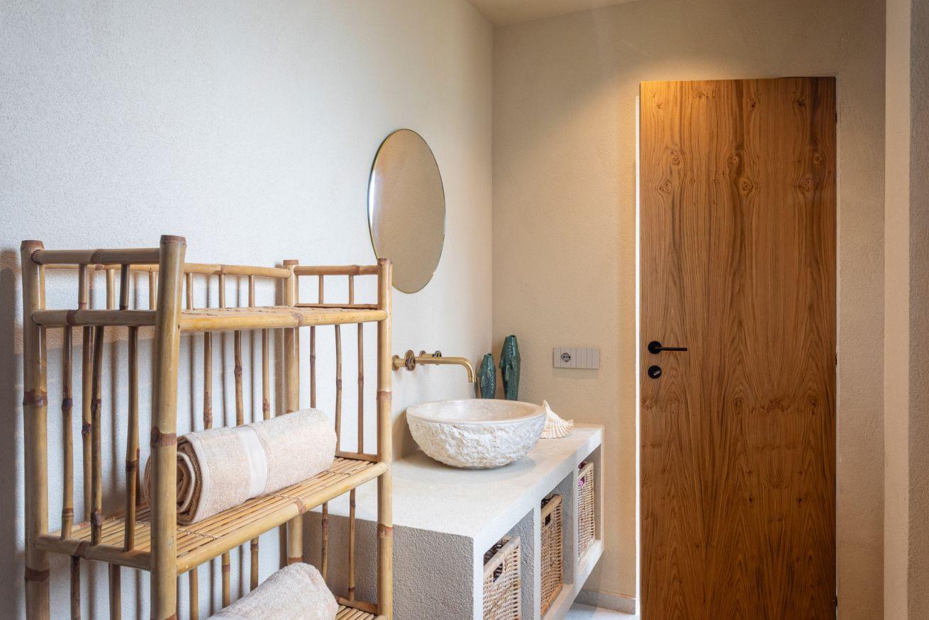 Inside, the villa is tastefully decorated with neutral colors, wood and rattan details, creating a warm and relaxing Mediterranean atmosphere.