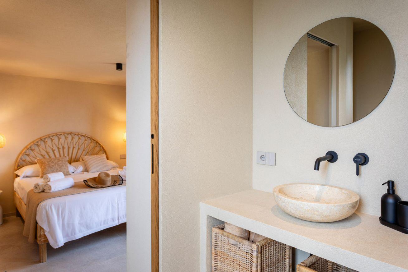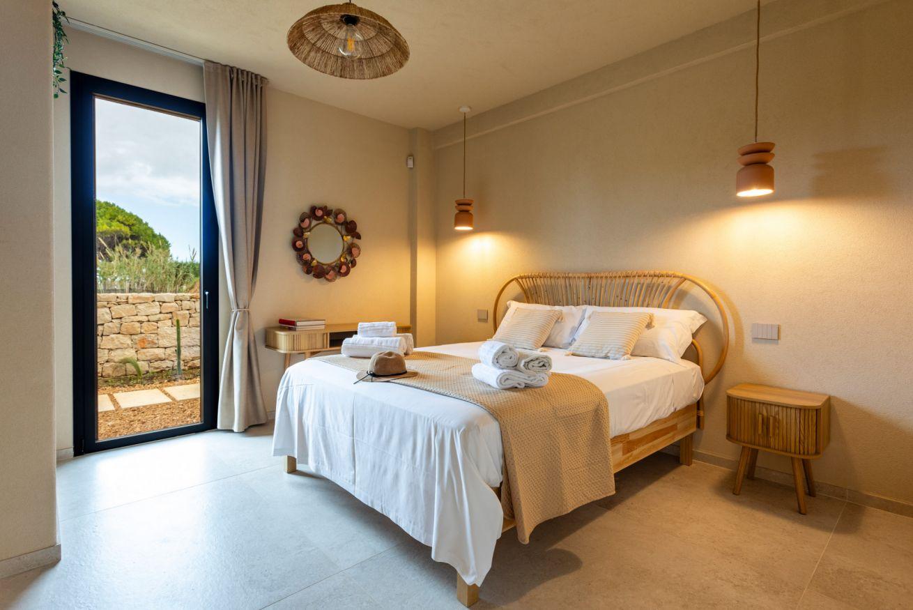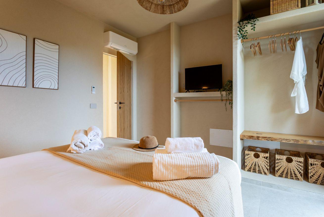 Inside, the villa is tastefully decorated with neutral colors, wood and rattan details, creating a warm and relaxing Mediterranean atmosphere.