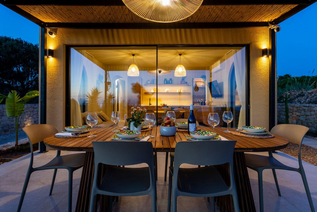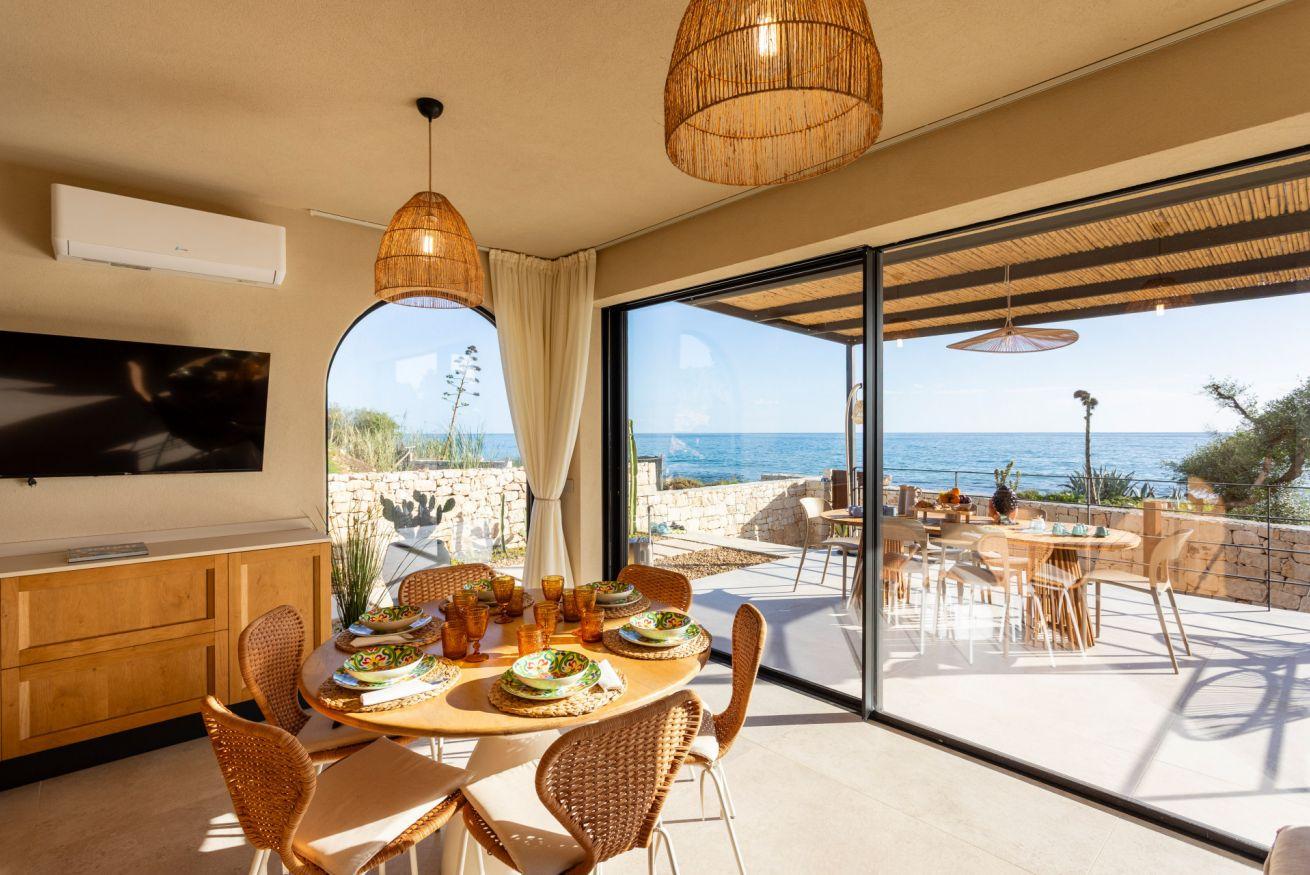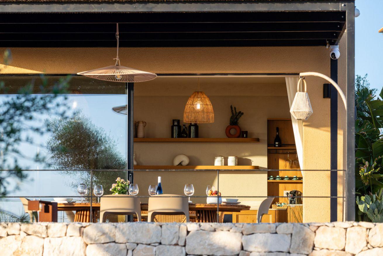 The villa features a beautiful panoramic veranda, ideal for outdoor breakfasts and dinners with a sea view. Large glass doors connect the veranda to the fully equipped kitchen, flooding the interiors with natural light and framing the blue horizon.